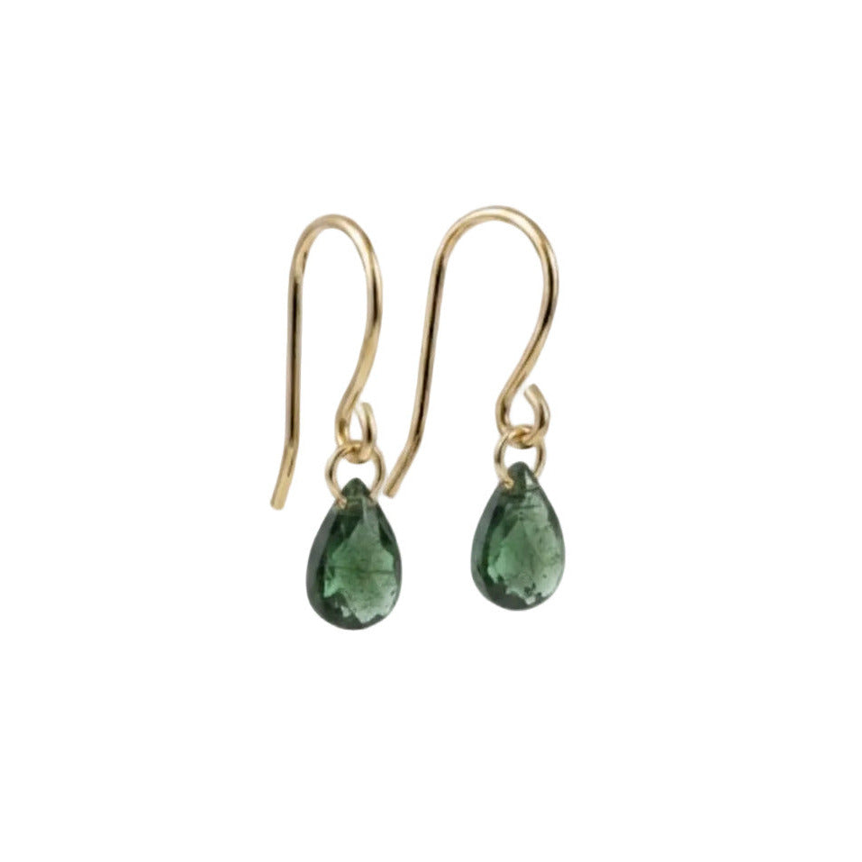 Disse øreringe er udført i 14 karat guld og monteret med dråbeformede mørkegrønne safirer. Safirerne hænger frit i en enkel guldkrog, hvilket giver bevægelse i smykket, når du har dem på.