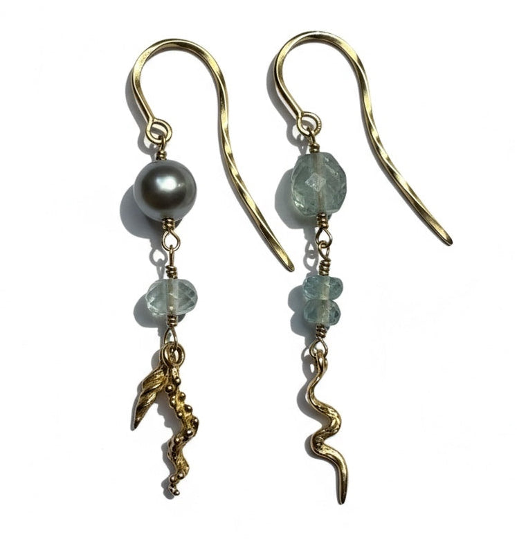 Unika øreringe i 14 kt guld med akvamarin, grå Akoya-perle og håndlavede vedhæng inspireret af havet.