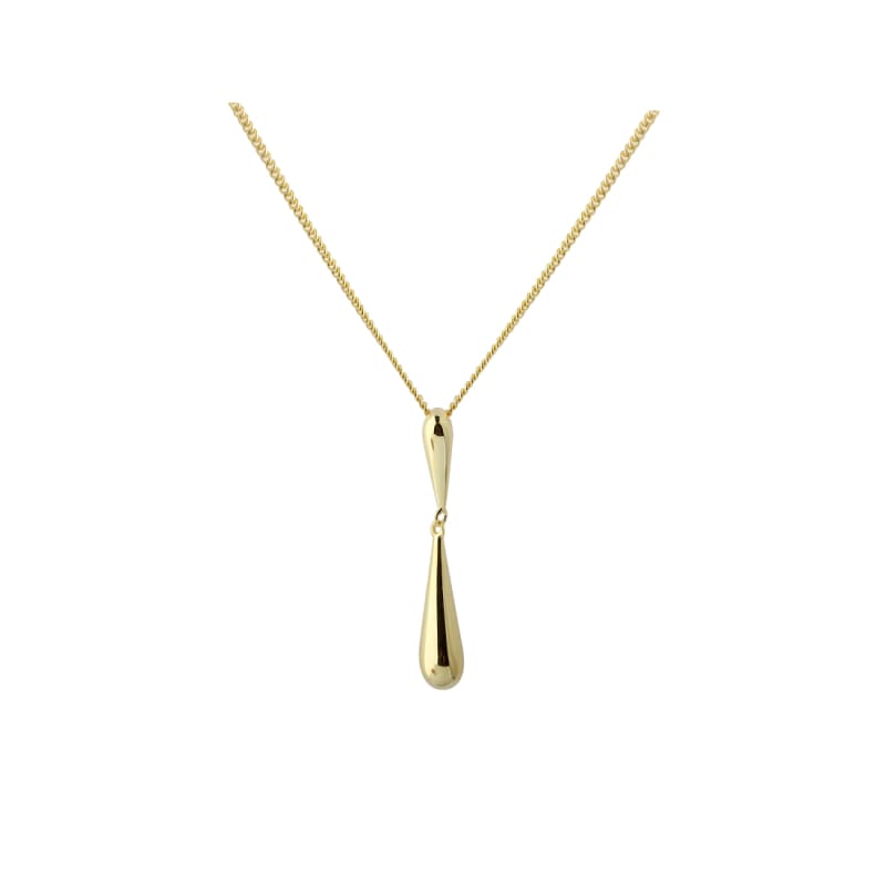 Halskæden er fremstillet af forgyldt sølv og er inspireret af en fusion mellem to dråber.