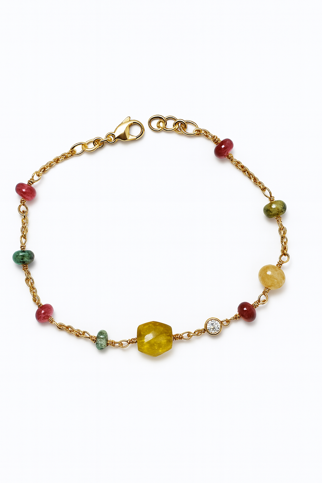 Dette eksklusive armbånd er håndlavet på vores eget guldsmedeværksted hos Barbara Maria i Dragør og skabt som et unika – der findes kun dette ene. Smykket er udført i 14 karat guld og prydet med smukke turmaliner i levende farver, som giver et elegant og farverigt udtryk.