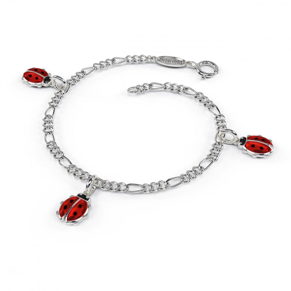 Armbåndet er fremstillet af sterling sølv og prydet med små fine mariehøns af emalje.