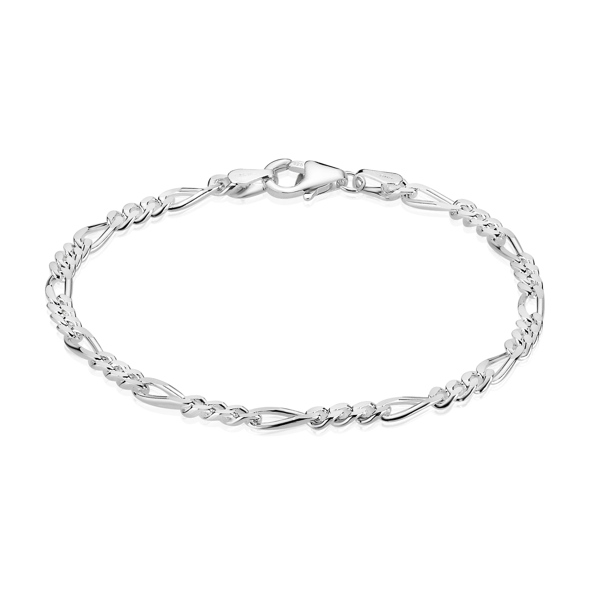 Dette armbånd er lavet i ægte, massivt sølv og måler 17 cm. Det er opbygget med det klassiske Figaro-mønster, som består af tre korte panserled efterfulgt af et længere, ovalt led. Det giver kæden et afbrudt forløb og et andet udtryk end en helt almindelig panserkæde.