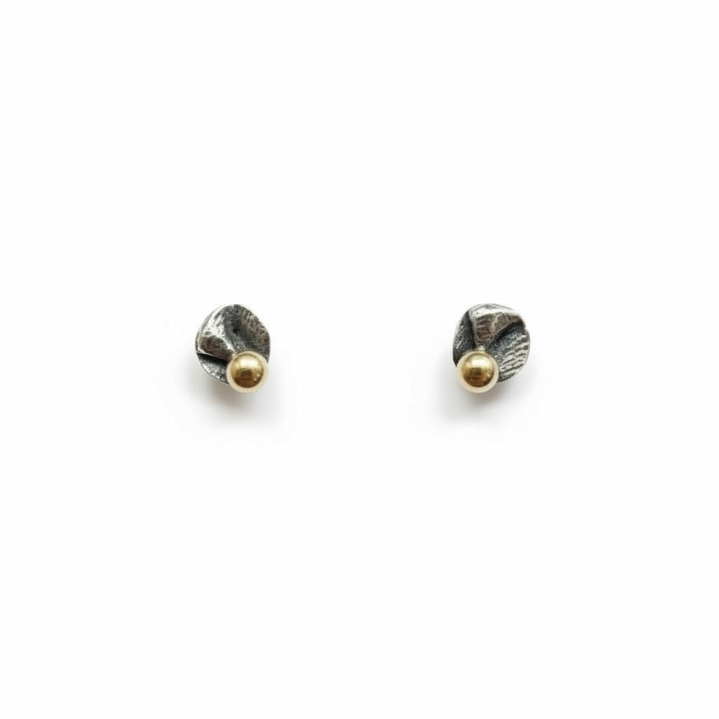 På siden er der placeret en lille kugle i 14 kt guld. Den blankpolerede guldkugle står i kontrast til det mørkere, foldede sølv og giver ørestikken et klart fokuspunkt uden at dominere udtrykket.