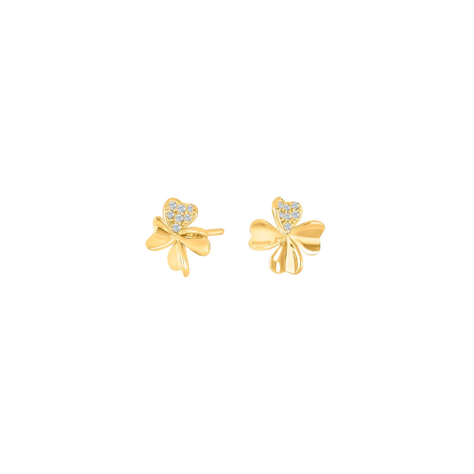 Små firkløver-ørestikker i forgyldt sterlingsølv, designet med bløde blade og et let løft i formen. Ét af bladene på hver ørestik er prydet med pavefattede klare zirkoner, som giver et diskret glimt uden at tage over. Formen er afrundet og åben, så lyset bevæger sig fint hen over bladene.