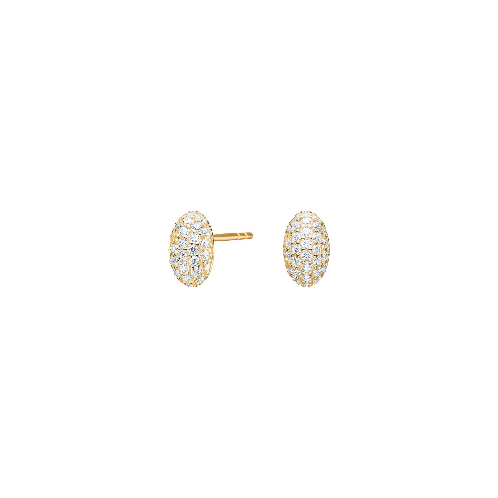 RebeccaNor-ørestikkerne er små, ovale studs med et tæt lag af klare zirkoner i pavé. Zirkonerne ligger samlet i en blød kuppelform, som giver et fint og jævnt glimt, når lyset rammer overfladen. Formen er enkel og tidløs, men den tætte pavé gør udtrykket mere markant end en klassisk stud.