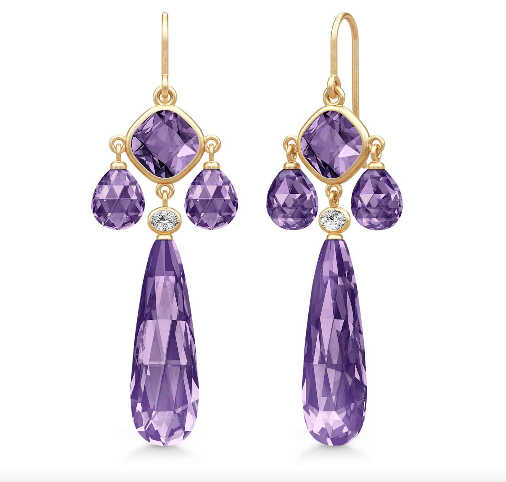 Julie Sandlau øreringe i 22 karat forgyldt sterlingsølv med satineret overflade. Øreringene er indfattet med lilla, facetslebne krystaller. Under den øverste sten er der indfattet en enkelt hvid zirkonia, som giver en diskret lyskontrast i designet.