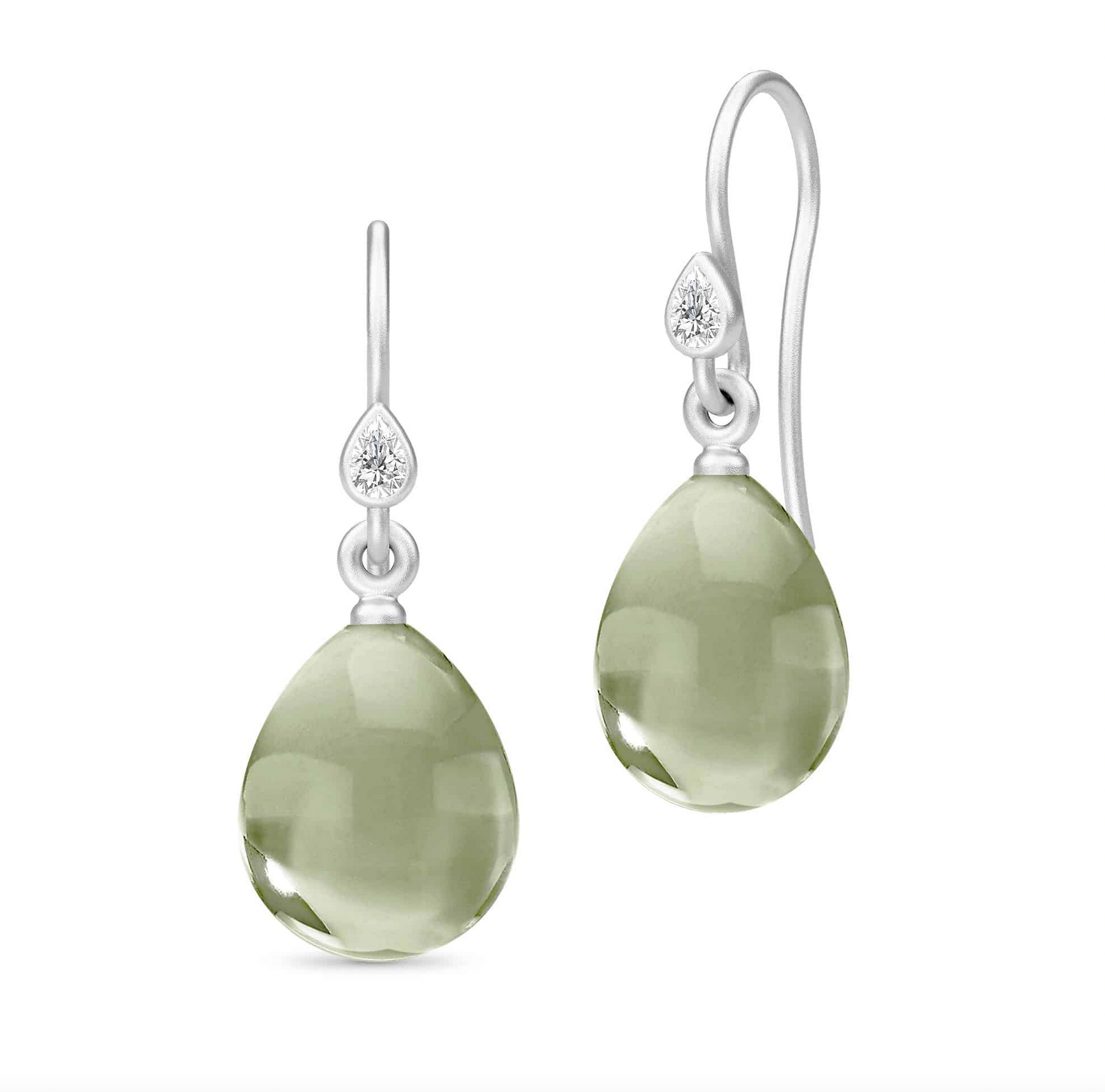Den fineste ørering, med en oliven grøn dråbeformet krystal. Øreringen er fremstillet i rhodineret, satineret sterlingsølv.