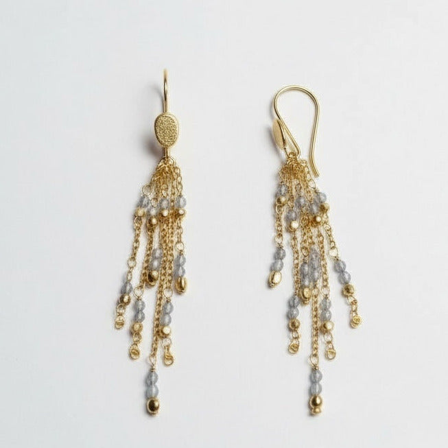 Karma Dans er et par elegante og festlige øreringe i forgyldt sølv med fem fine kæder og ægte iolith-sten. Øreringene hænger i en håndlavet krog med en lille mat guldplade og bevæger sig let ved hvert skridt – som små, sanselige bevægelser af lys og rytme.