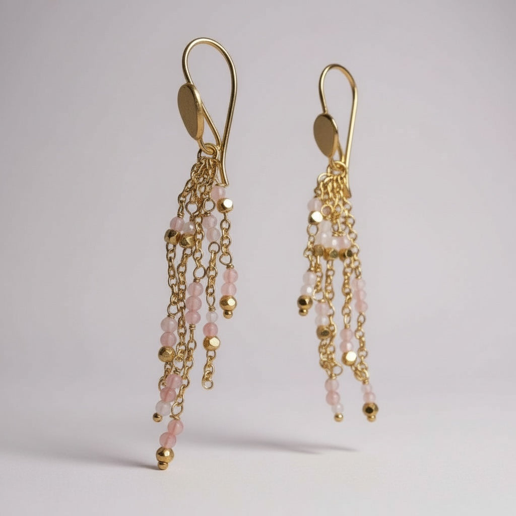 Karma Dans er et par elegante øreringe i forgyldt sølv med fem fine kæder dekoreret med små kugler af rosa kvarts. Øreringene hænger fra en håndlavet krog med en mat guldplade og bevæger sig let og levende – som et smykke skabt til glæde og nærvær.