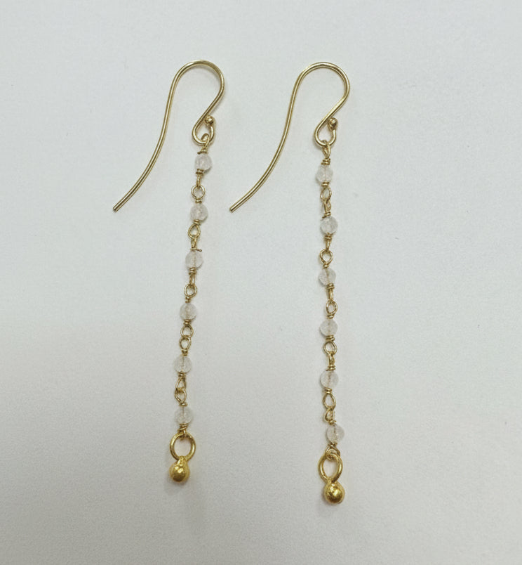 Karma Sti er en feminin ørering i forgyldt sølv med fem små rosa kvarts-sten og en forgyldt kugle nederst. Den fine kæde skaber en let bevægelse, der giver et elegant og blødt udtryk.