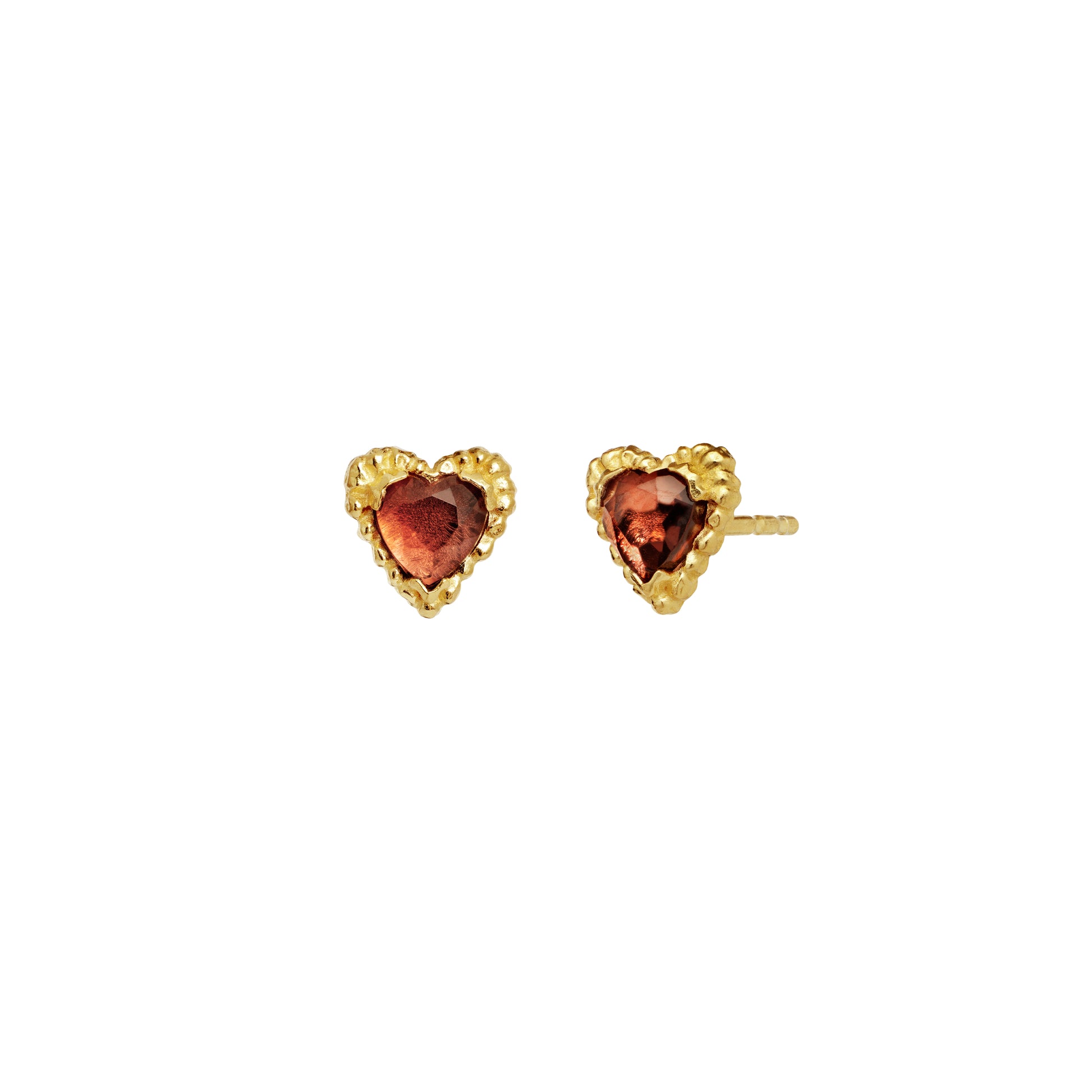 Lina Rosa øreringe fra Maanesten er hjerteformede ørestikker med pink granat i midten. De fine hjerter måler ca. 7,7 × 7,7 mm og er fremstillet i genanvendt sterlingsølv (925), belagt med 18 karat guld. Kombinationen af det gyldne udtryk og granatens dybe rosa farve gør Lina Rosa til et romantisk smykke, der symboliserer kærlighed og medfølelse.