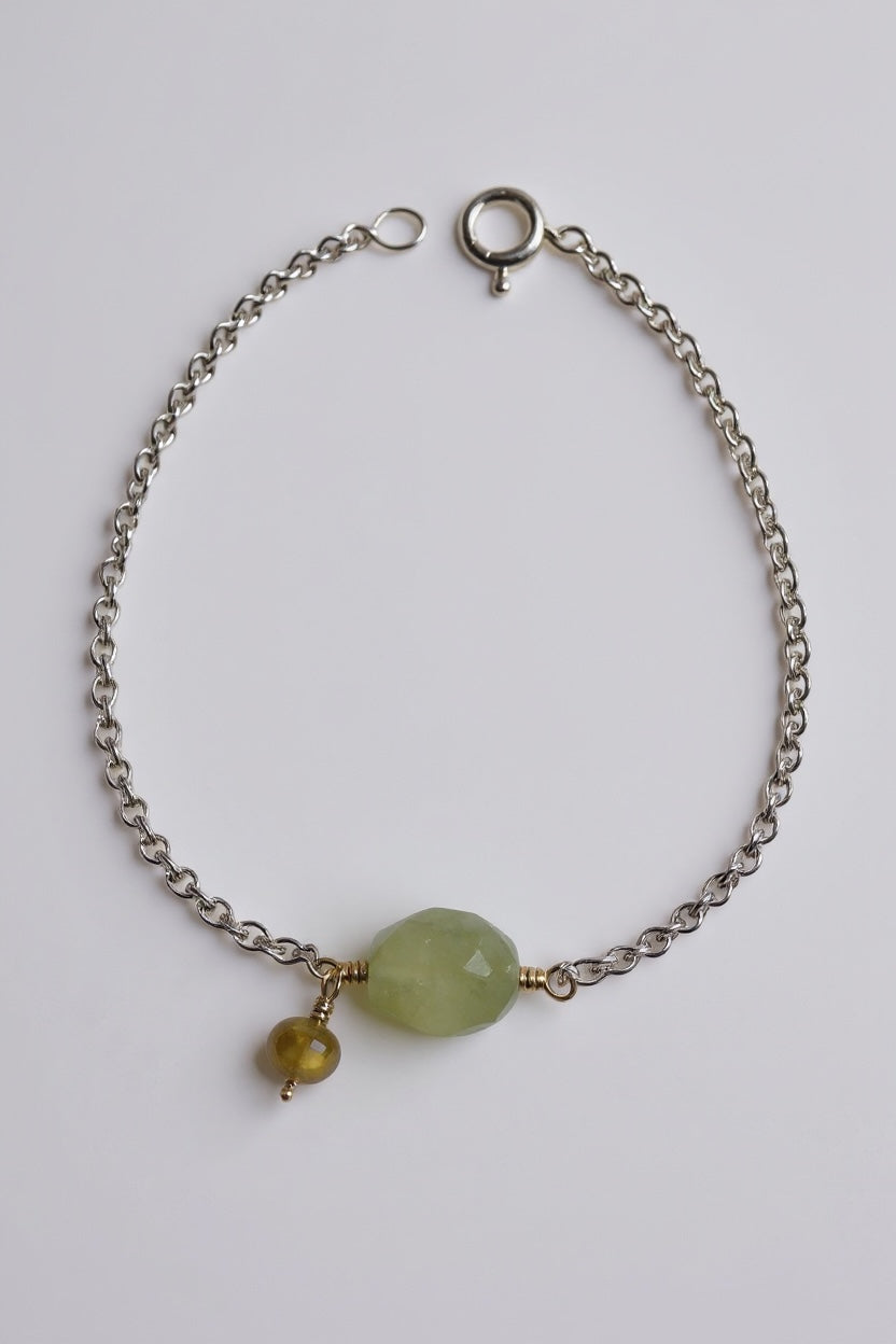 Håndlavet armbånd i sterlingsølv med to naturlige turmaliner. Alle viklinger og detaljer er udført i 14 kt guld, hvor den lille funklende guldterning tilfører armbåndet et legende lysglimt – som en diskret palliet i metallet.