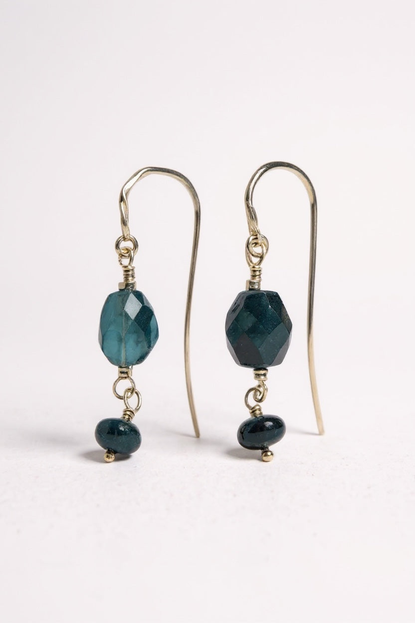 Øreringene er udsmykket med to mørkegrønne turmaliner i en særlig smuk farve. Den øverste sten er facetteret og fanger lyset med et diskret, levende spil, mens den nederste turmalin er cabochon-slebet og gennemboret, hvilket giver en blød glød og dybde i farven. Sammen skaber de en harmonisk balance mellem glans og ro.