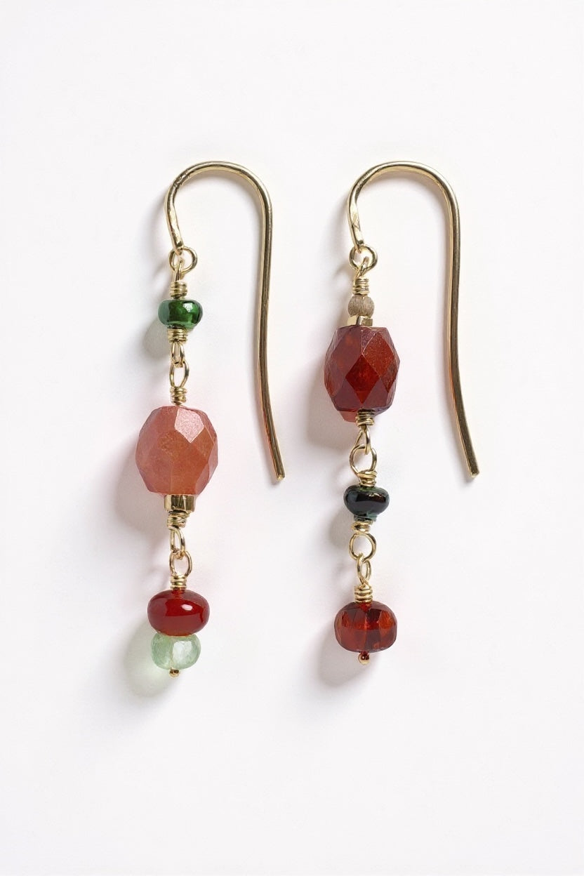 De facetterede sten fanger lyset og skaber et diskret spil, mens de håndlavede ørekroge i guld har et let twist, der giver bevægelse og balance. Alle detaljer er nænsomt håndpoleret for at fremhæve guldet og de naturlige stenfarver.