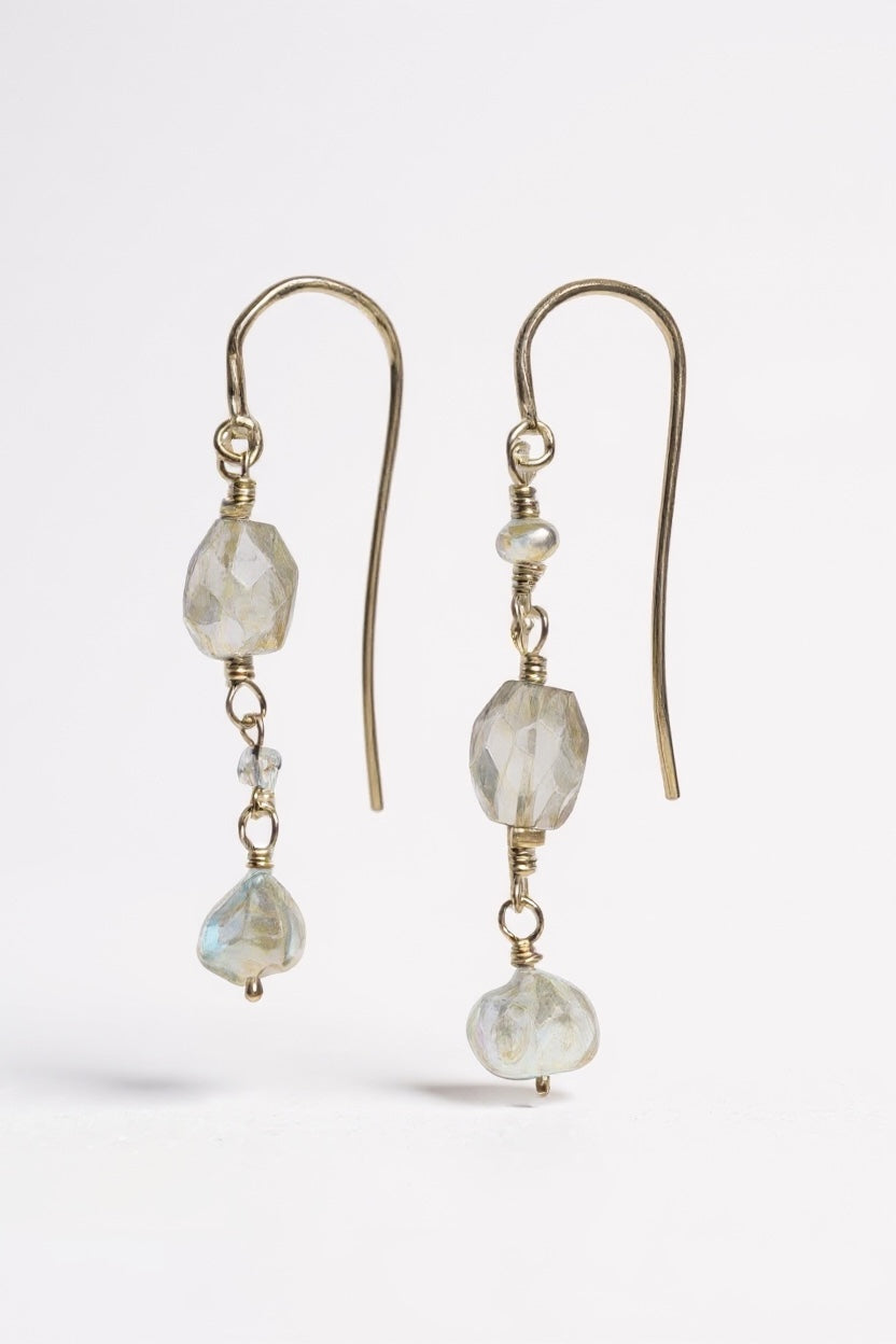 Øreringene kombinerer to barokke hvide perler, to naturlige turmaliner og en enkelt briolette diamant. Diamanten er facetteret og gennemboret, så den hænger frit og fanger lyset med et smukt, funklende spil. Sammen skaber materialerne et elegant samspil mellem det bløde, organiske og det glitrende raffinerede.